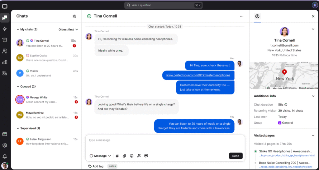 如果您是管理员,则可以单击任何会话中的聊天来监视其进度。如果您认为可以对对话有所了解,则LiveChat的公司聊天软件具有Whisper功能,可让您直接在聊天窗口中键入内容。操作员看到这些评论,但客户看不到。