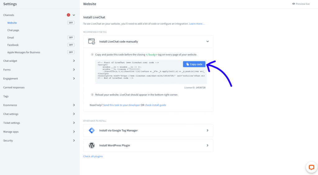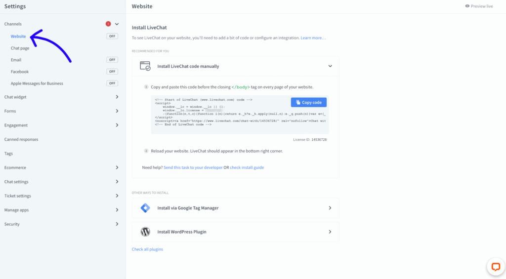 - 登录您的 LiveChat 帐户并转到“设置”>“频道”> “网站”。